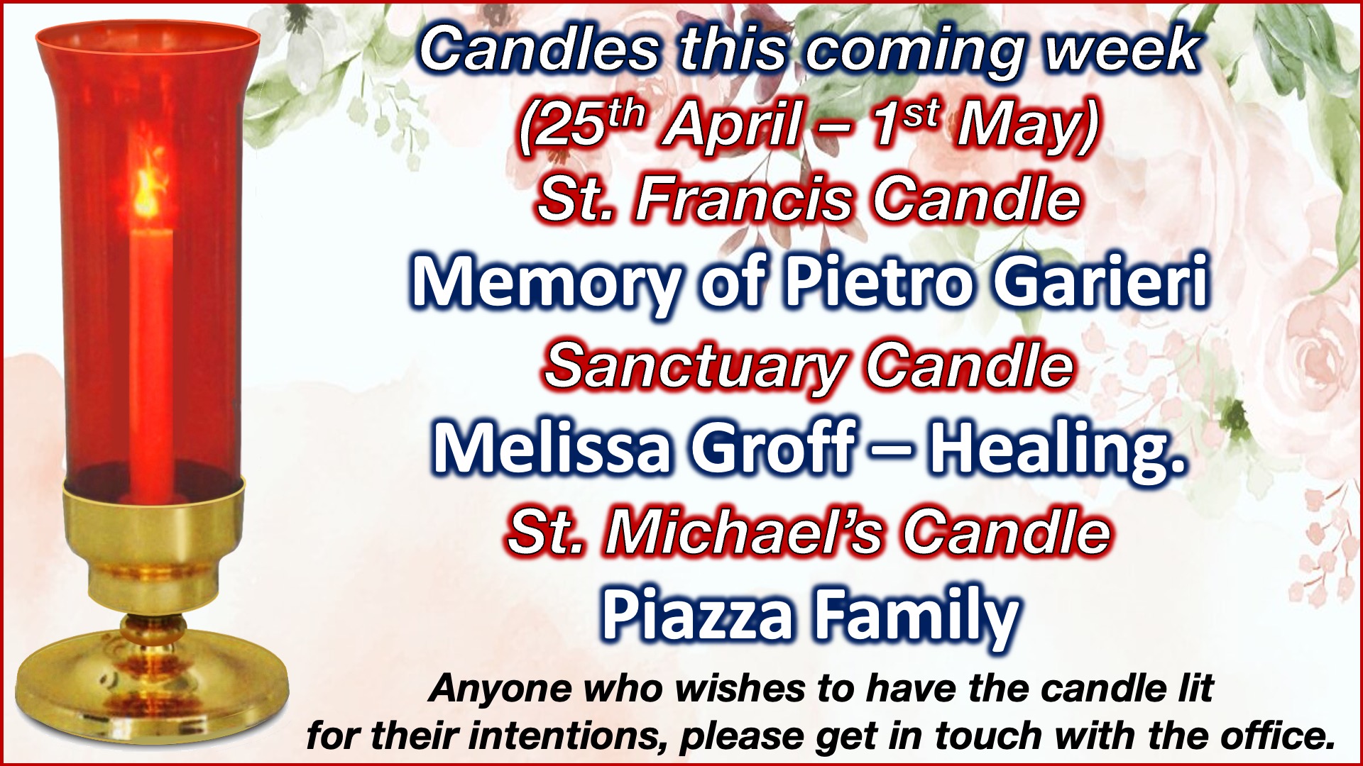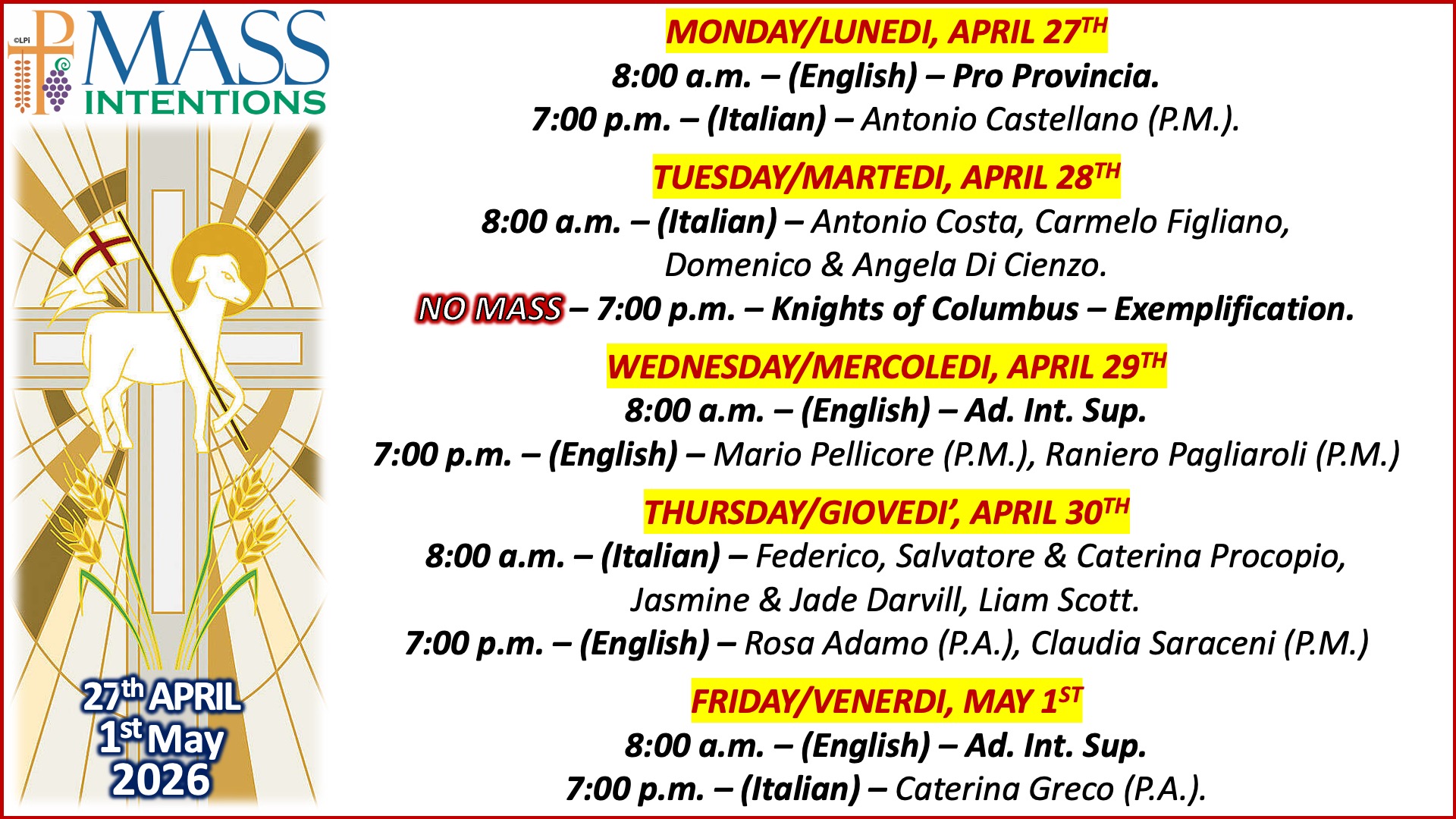 - Weekday Morning Mass: Monday, Wednesday & Friday 8:00am English OR Tuesday, Thursday & Saturday 8:00am Italian