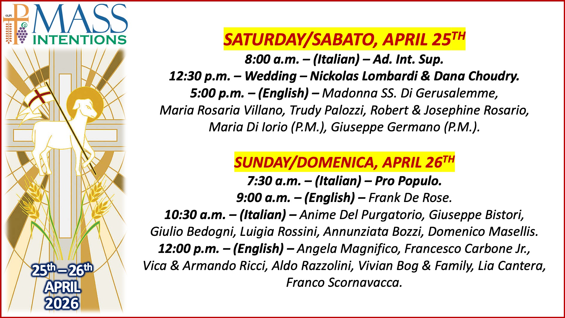 - Sunday Mass: 9:00am & 12 noon English OR 7:30am & 10:30am Italian,